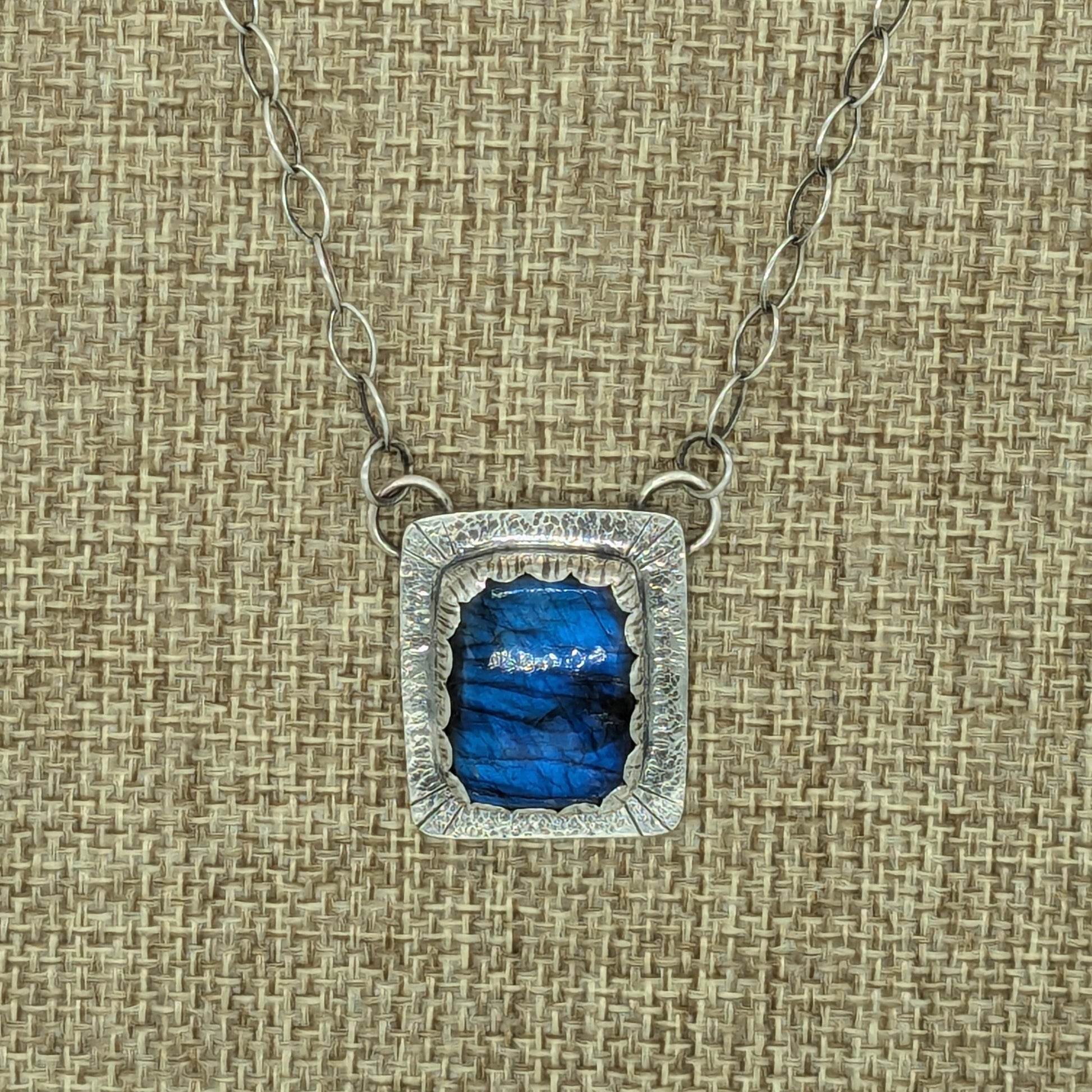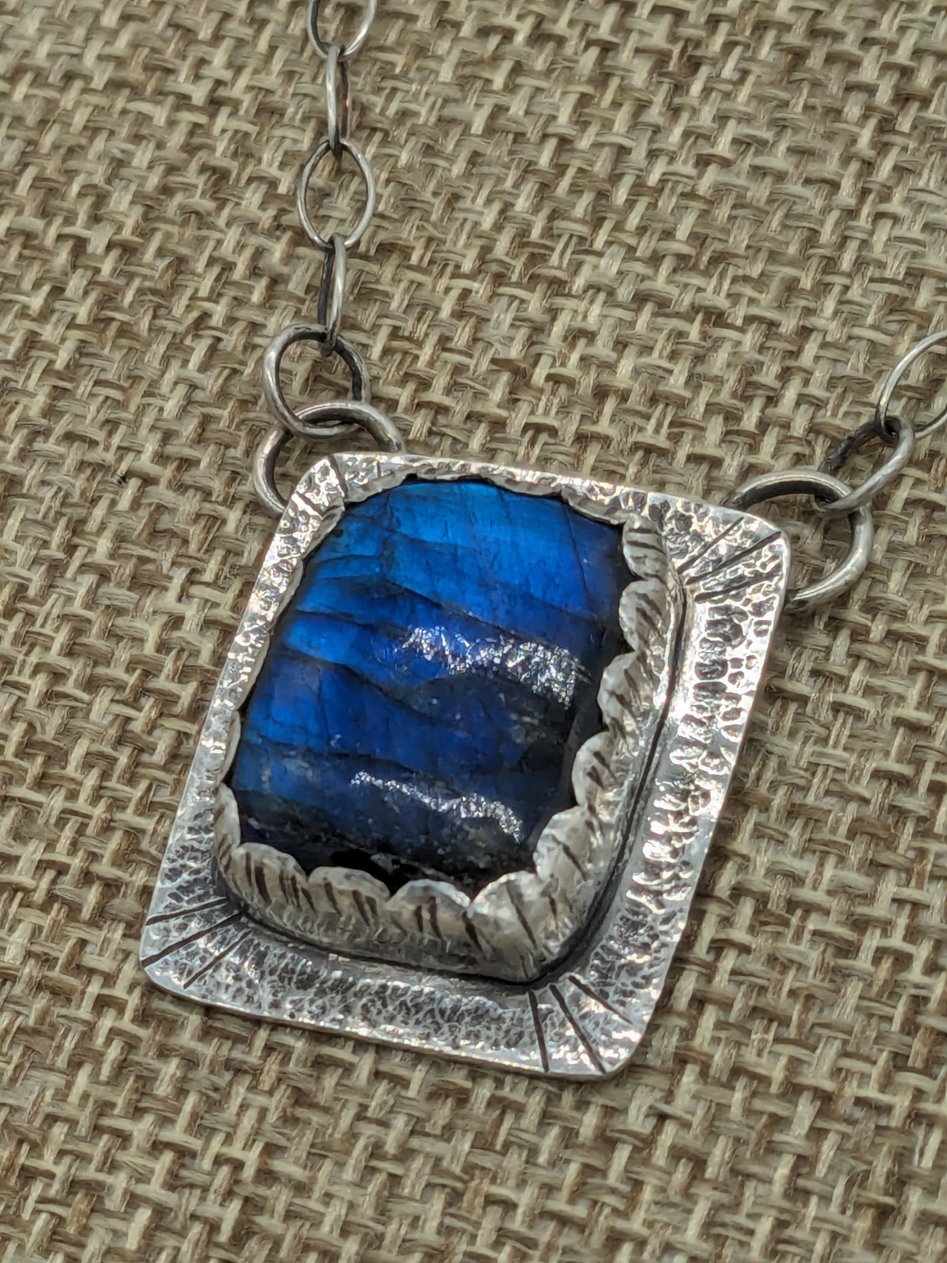 Ultra flashy blue labradorite in a rustic, hammered sterling silver setting with hand forged closure.